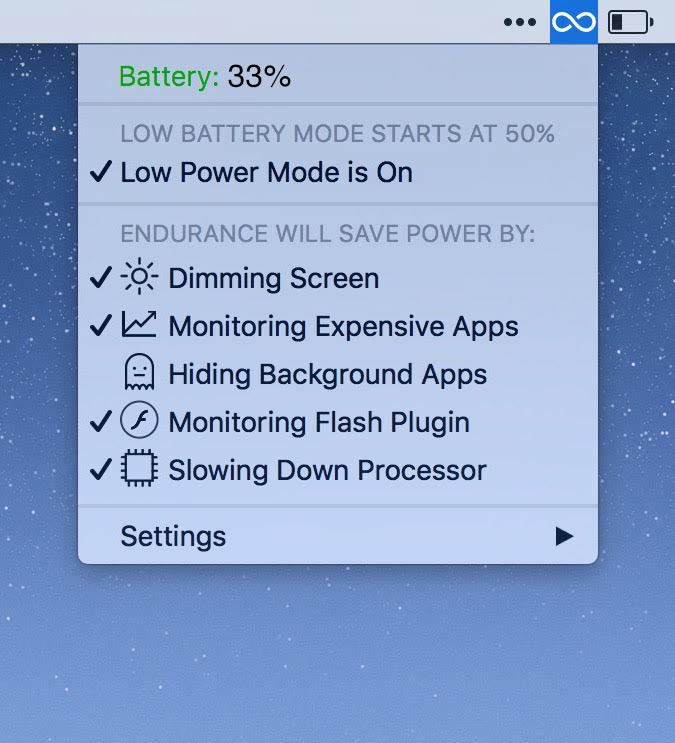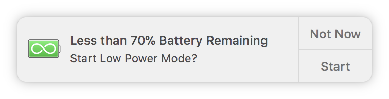 You've already got enough to think about, so Endurance automatically integrates with your Mac. When your battery hits the 70% charge level, you'll be prompted to go into low power mode. Or, are you a consistent user? You can have Endurance kick in automatically. Interested in a different trigger level? It's all customizable. You can even have it start up the minute you unplug your battery from your Mac.